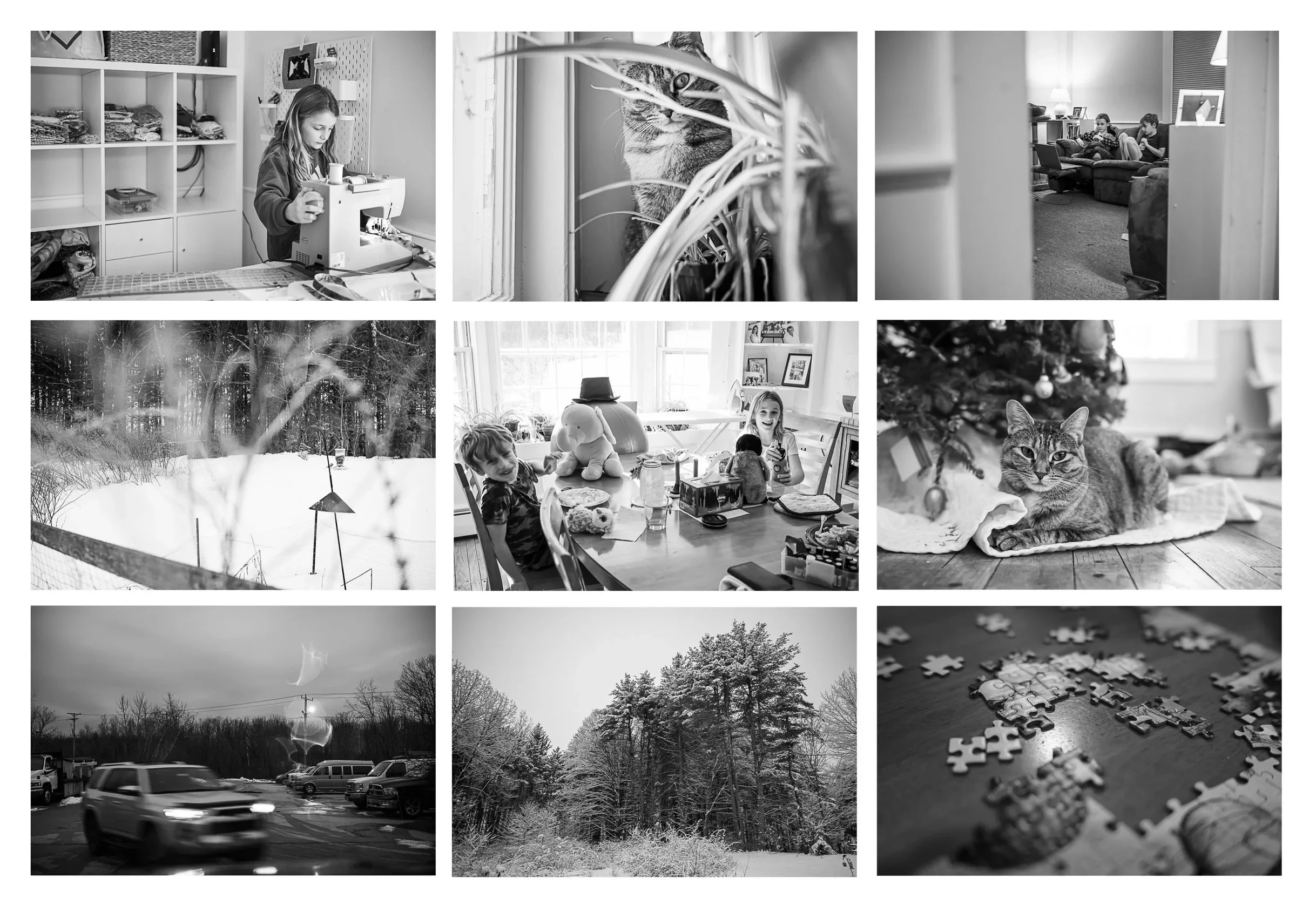 In these photos, I see my daughter’s love of sewing, my cat in her favorite spots, the bird feeder outside my window that’s endlessly entertaining, the blur that is waiting-in-the-car-for-after-school activities, and the quiet beauty of winter. I see my kids growing fast but also still very young at heart. I see their friendship and how winter is a time for getting cozy and finding enjoyment in little things like puzzles and wildlife and the extra-bright light bouncing off the snow and into our home.